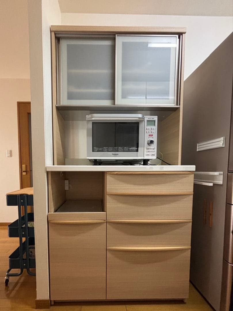 - 高い家具は圧迫感があってあんまり好きじゃないのでミドルと迷ったんですけども、収納力を優先させてこれに決めました。 炊飯器とポット、レンジ、食器類などをこれ一つで収納できるので、かなり効率がいいと思います。 組み立てタイプなのも、マンションのような運搬に制限があるところでも持ち込めるからありがたいです。